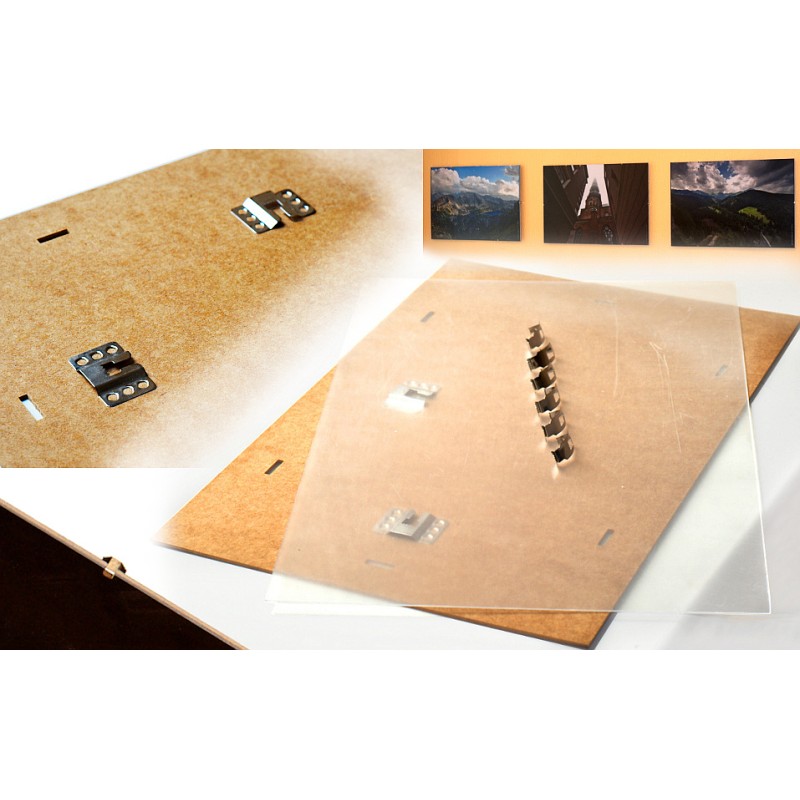 antirefleksijas virsmu un preskartonu kopā savieno ar metāla skavām.